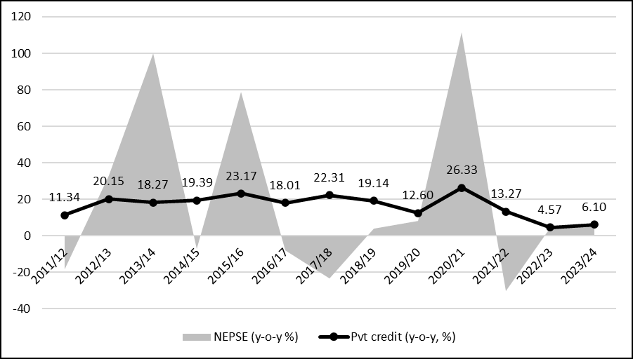 चित्र २: नेप्से इण्डेक्स तथा बैंकहरुवाट निजी क्षेत्रमा प्रवाहित कर्जाको वृद्दिदर (वार्षिक)